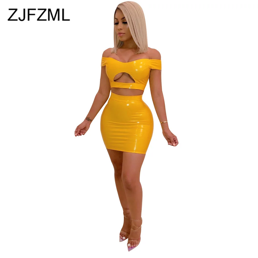 Most effective PU Leather Two Piece Matching Set Women Slash Neck Front Cut Out Crop Top And Bodycon Skirt Neon Ye