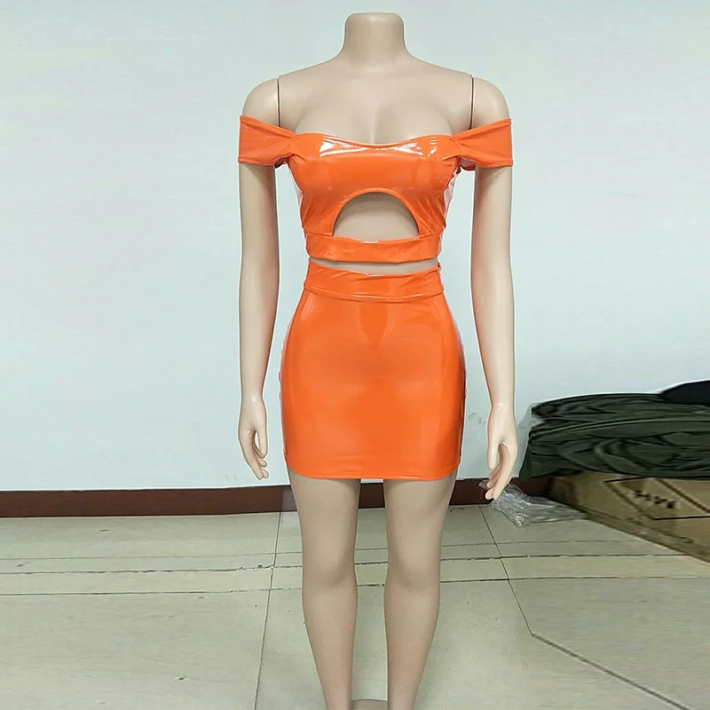 Best PU Leather Two Piece Matching Set Women Slash Neck Front Cut Out Crop Top And Bodycon Skirt Neon Ye
