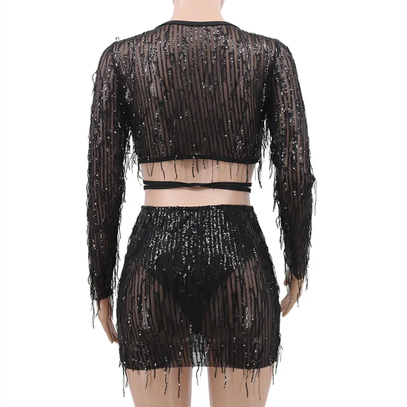 discount ANJAMANOR Sexy Fall 2 Piece Sets Womens Night Club Outfits Sequins Tassel Beaded Sheer Mesh Black T