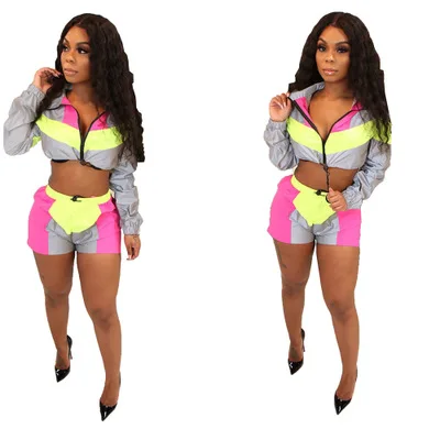 2019 Women's Summer Reflective Spaghetti Strap Top Short & Shorts Suit Fashion Sport Two Piece Set Tracksuit Casual Dress,2019 new women zipper long sleeve top trench top shorts two-piece suit set sport sportswear women tracksuit outfit T3322H, 2019 new women zipper long sleeve top trench top shorts two-piece suit set sport sportswear women tracksuit outfit T3322H