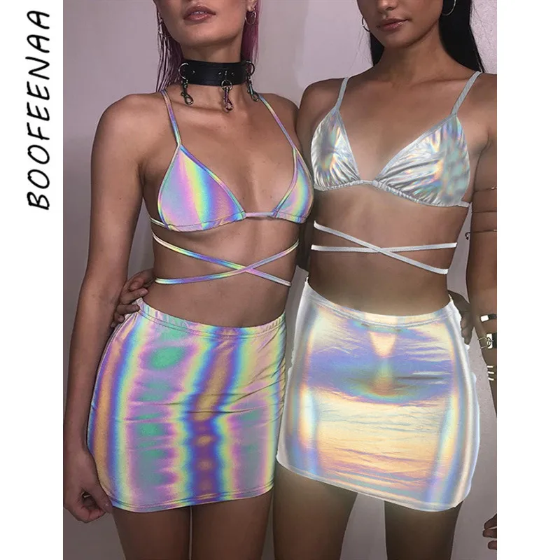 amazing BOOFEENAA Holographic Matching Sets Bodycon 2 Piece Set Crop Top and Skirt Sexy Summer Outfits Club