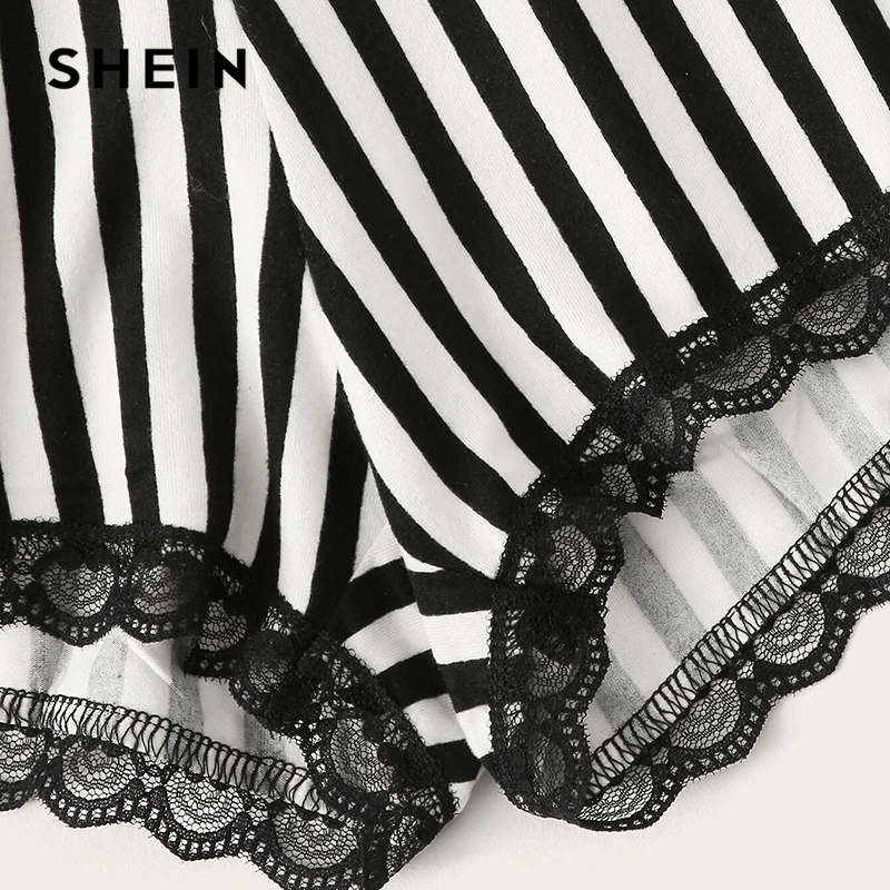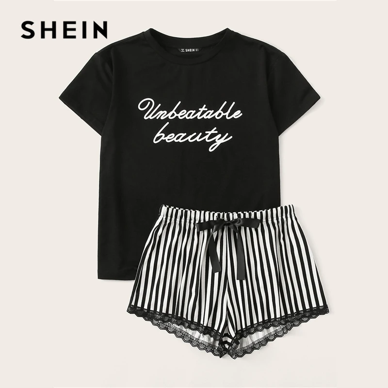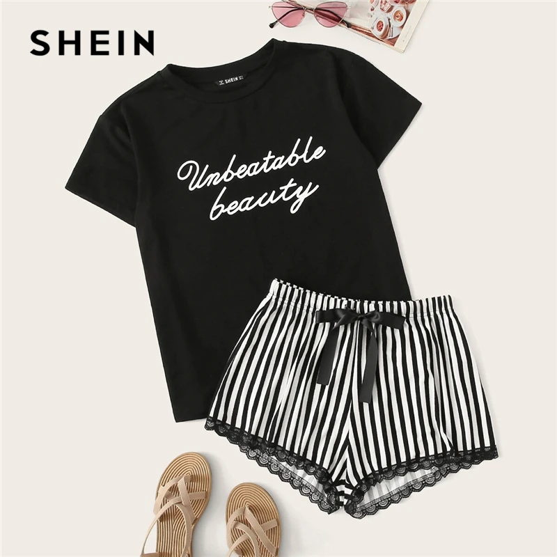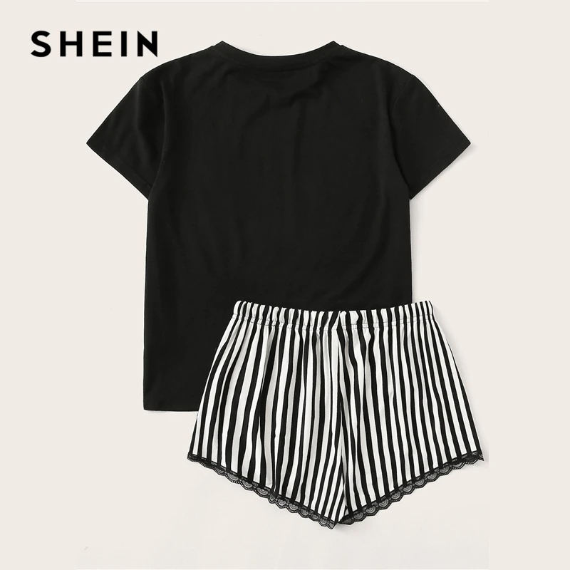 Very best SHEIN Black Letter Print Top and Lace Trim Striped Shorts PJ Set Summer Pajamas Women Casual Sleepw