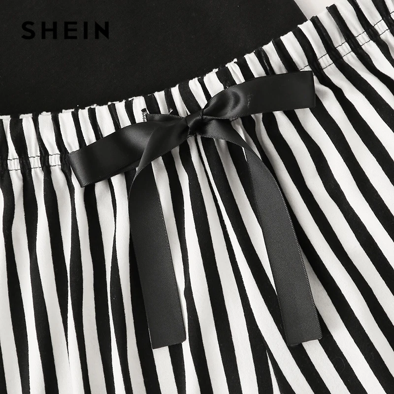 SHEIN Black Graphic Tee Frilled Striped Shorts PJ Round Neck Short Sleeve Set 2019 Summer Women Patchwork Sleepwear,SHEIN Cat Print Tshirt And Heart Elastic Waist Shorts Casual Sleepwear Women Summer Cute Round Neck Short Sleeve Pajama Set, SHEIN Cat Print Tshirt And Heart Elastic Waist Shorts Casual Sleepwear Women Summer Cute Round Neck Short Sleeve Pajama Set